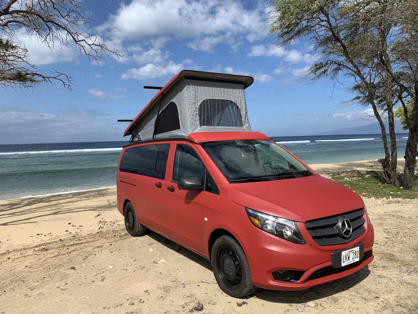 It sleeps 4, which is rare at this price point, and it has 10 perfect reviews behind it. The Mercedes Metris pop-top format is practical for most travelers — easy to drive, easy to park, and comfortable enough for a multi-night trip across the island.