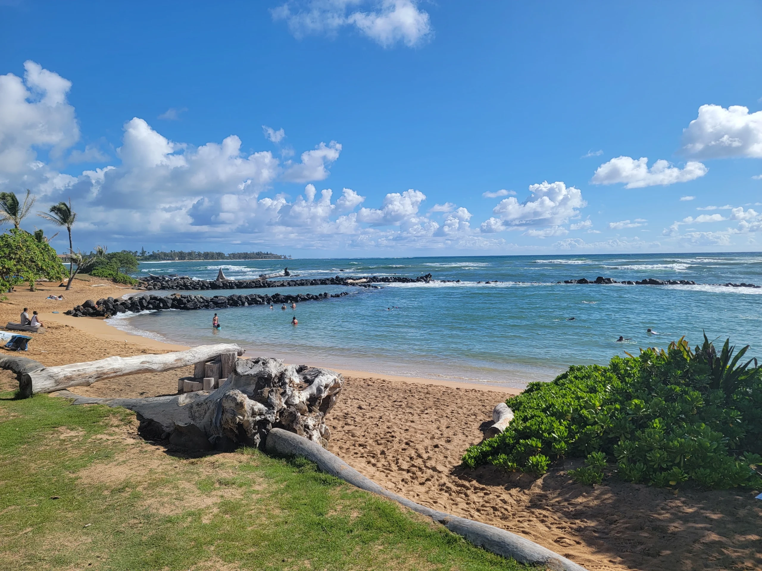The beach here has a rock barrier that creates a calm lagoon. Because of that, many families choose Lydgate for swimming. The water stays gentler than many other Kauai beaches.