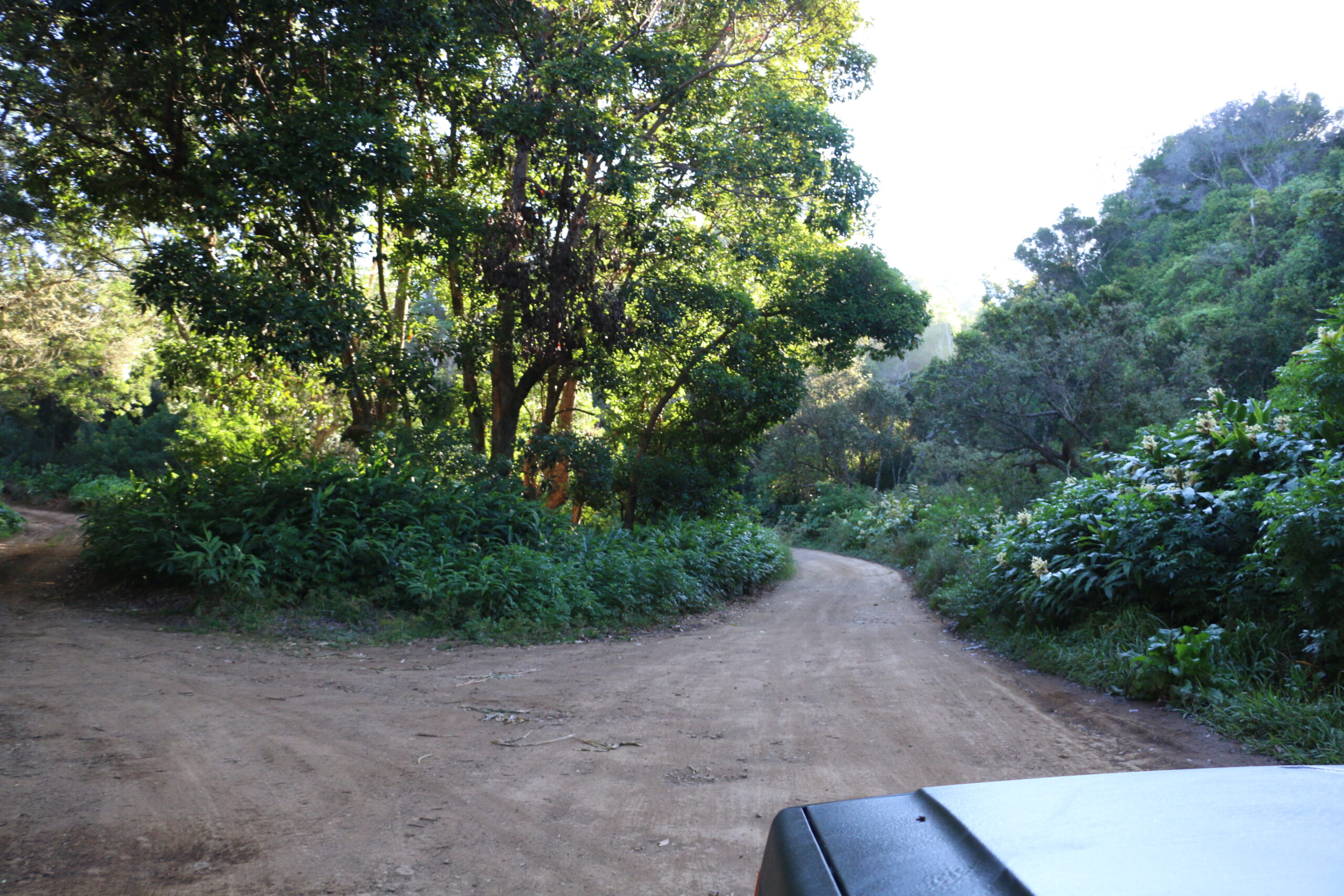 Drive up Koke‘e Road (Highway 550) until you reach the Koke’e State Park Campground. Just past the campground on your right you’ll see a dirt road. When you turn onto the dirt road I recommend resetting the trip meter on your car. You’re going to be driving 3.4 miles until you hit Sugi Grove.
